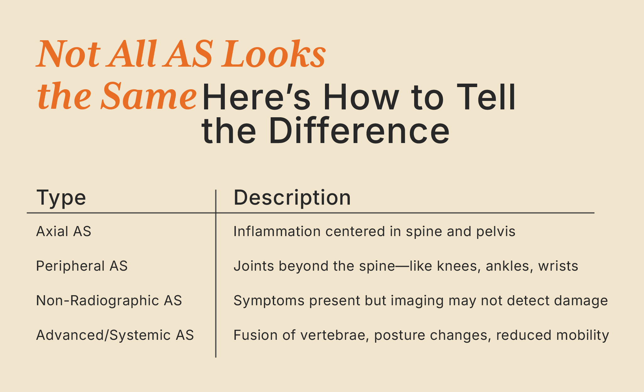 - Early-Stage or Non-Radiographic AS – Symptoms exist but imaging may not yet show joint damage.