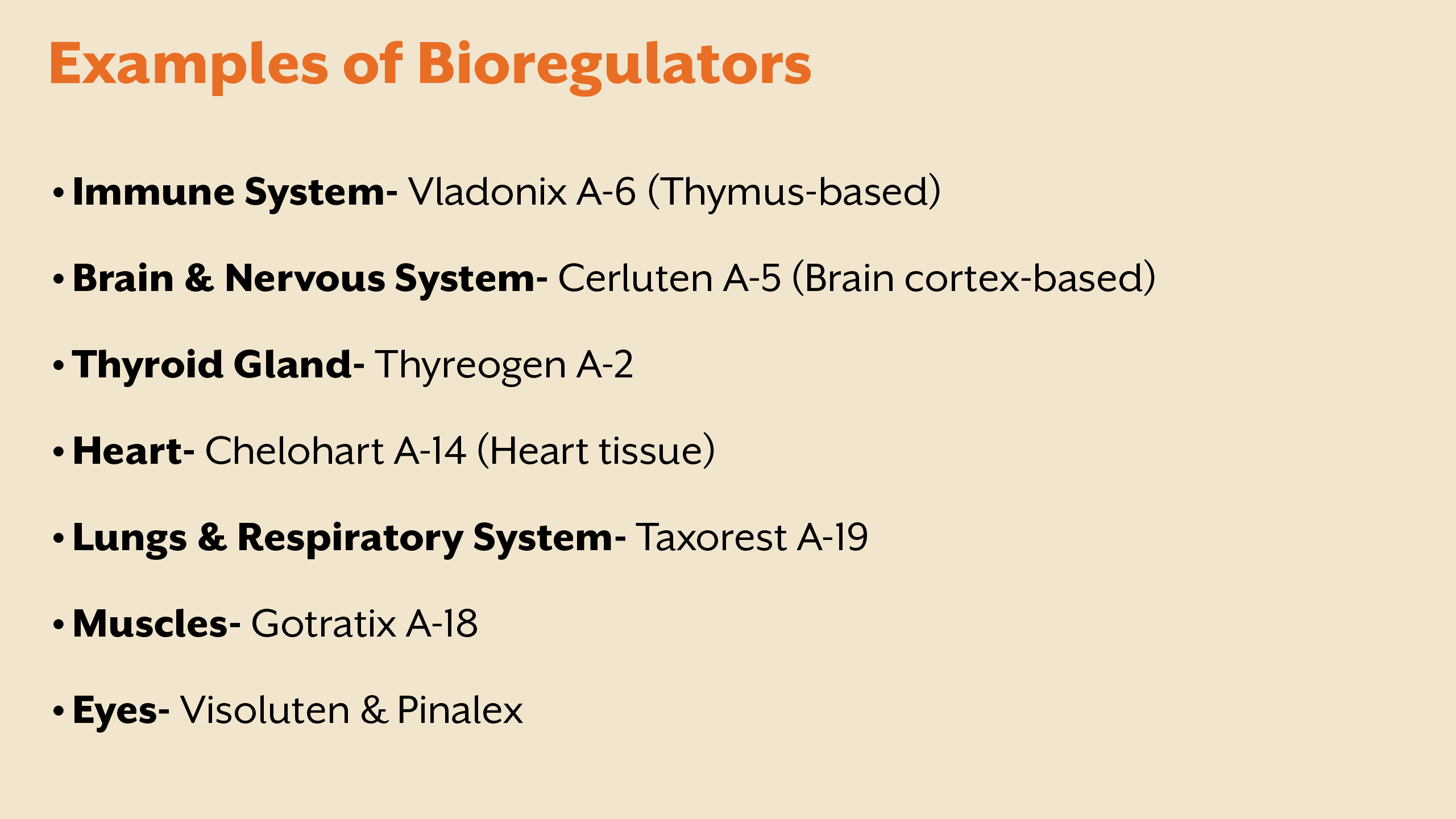 Bioregulators, on the other hand, are targeted. Each one is made to help a particular organ or system in your body. For example: