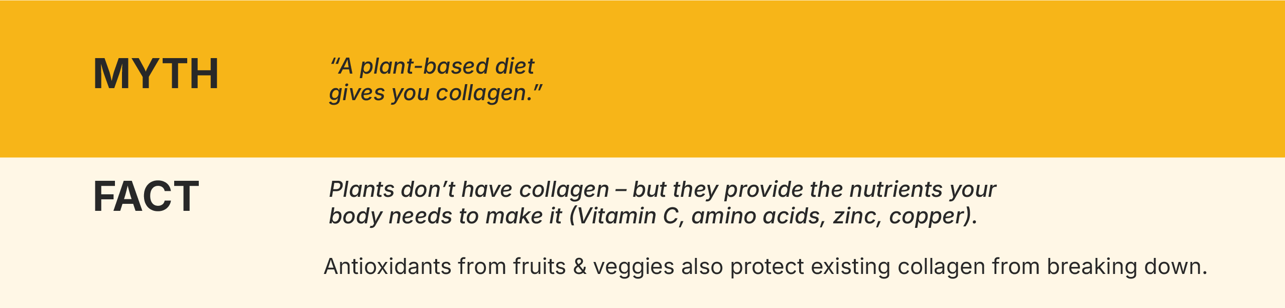 A vegetarian diet can give you some of the cofactors your body needs to make collagen, such as vitamin C, zinc, and copper. However, it doesn't have collagen itself or the whole amino acid profile your body needs to make it the best way.
