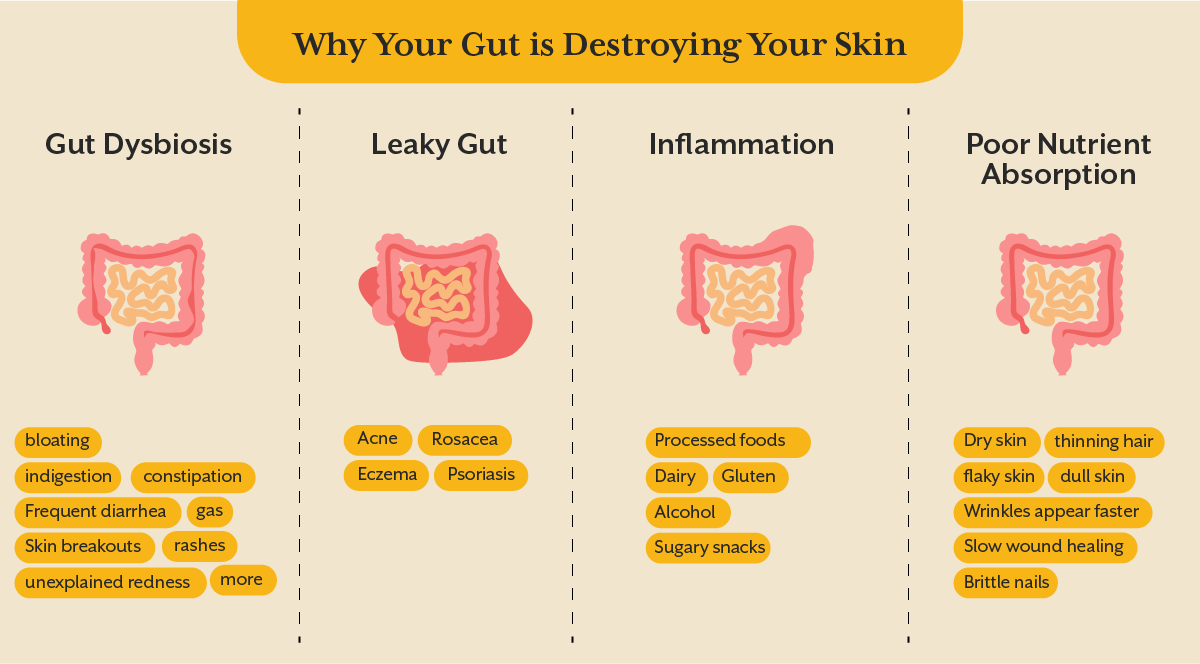 When harmful bacteria take over, it leads to gut dysbiosis, a condition that wreaks havoc on your body, including your skin.