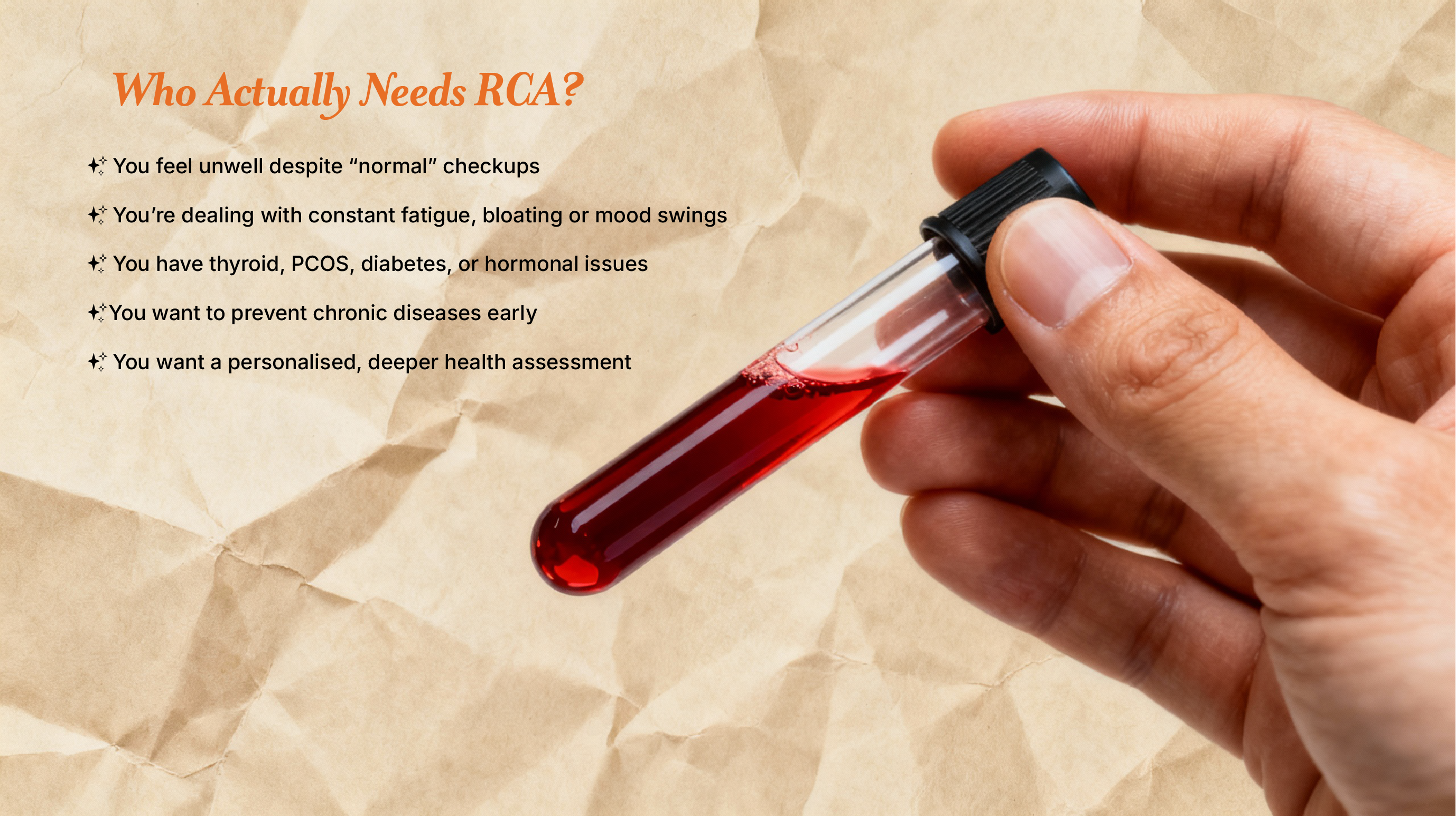 RCA is a comprehensive health assessment where more than 55+ blood parameters are analysed. Based on these, your full health status is evaluated, helping you understand why your body behaves the way it does, including weight management, energy levels, immunity, digestion, and hormone balance.