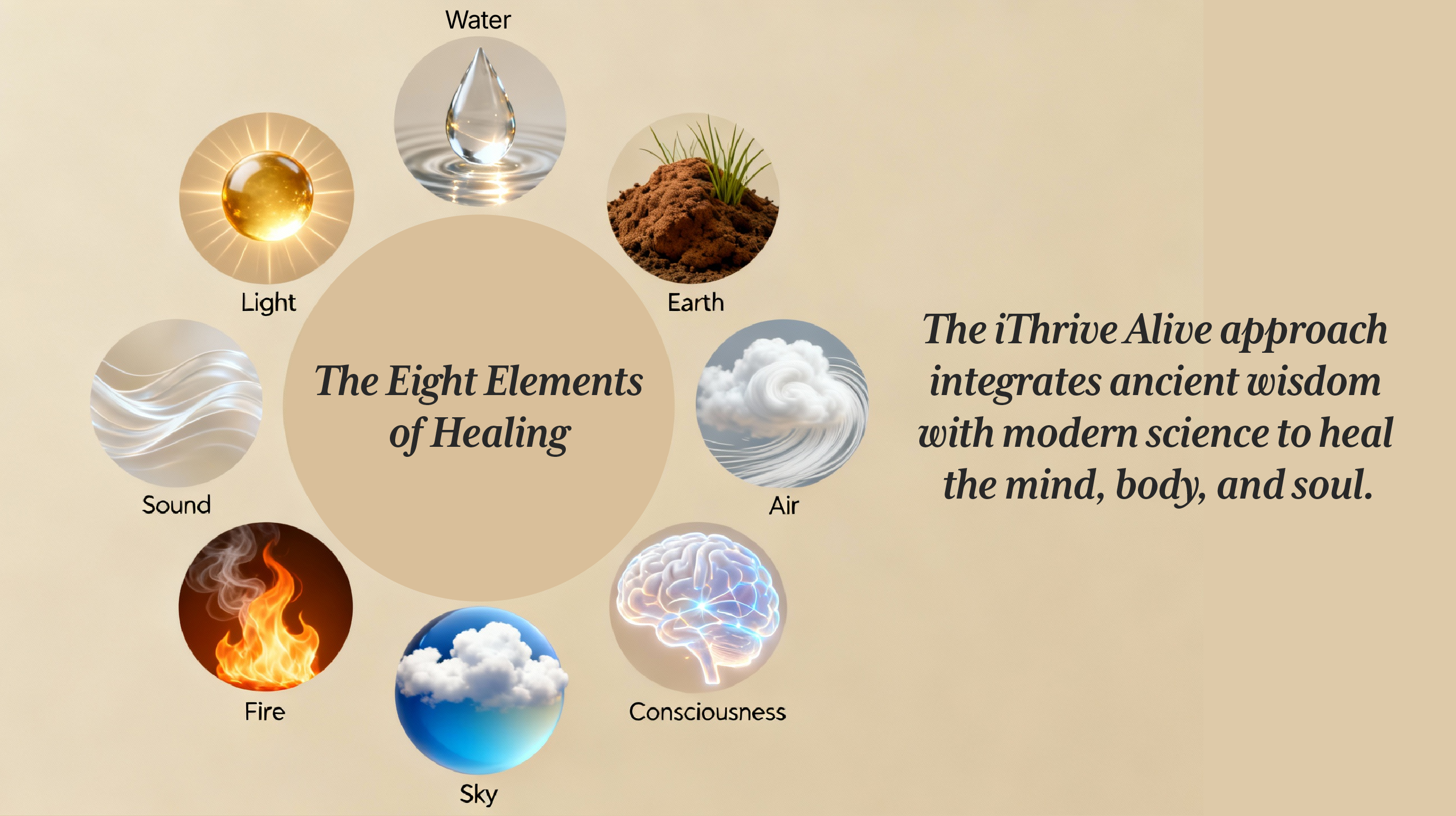 What truly sets iThrive Alive apart is its integration of ancient healing wisdom. The program draws from 8 elements that are Light, Earth, Air, Sky, Water, Sound, Fire and Consciousness to design various healing experiences that reach far beyond biology. These principles connect emotional, physical, and energetic aspects of life, further nurturing complete well-being in ways AI can’t measure.