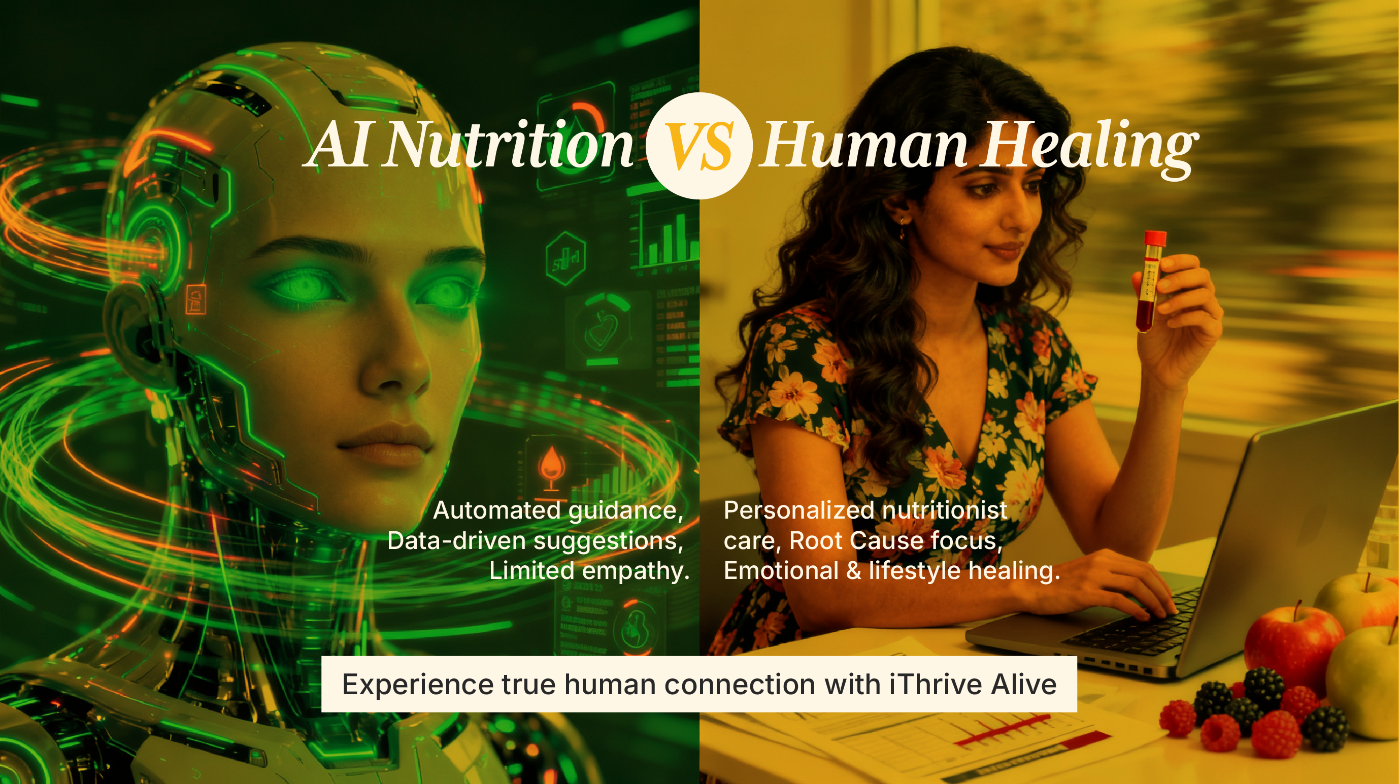 To truly understand this contrast, this blog will unpack how human-led nutrition through iThrive Alive stands apart from AI-based nutrition systems. We’ll explore how functional nutritionists through empathy, intuition, and science offer something no algorithm ever can: real connection, real transformation, and real healing.