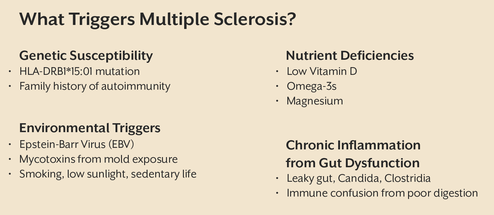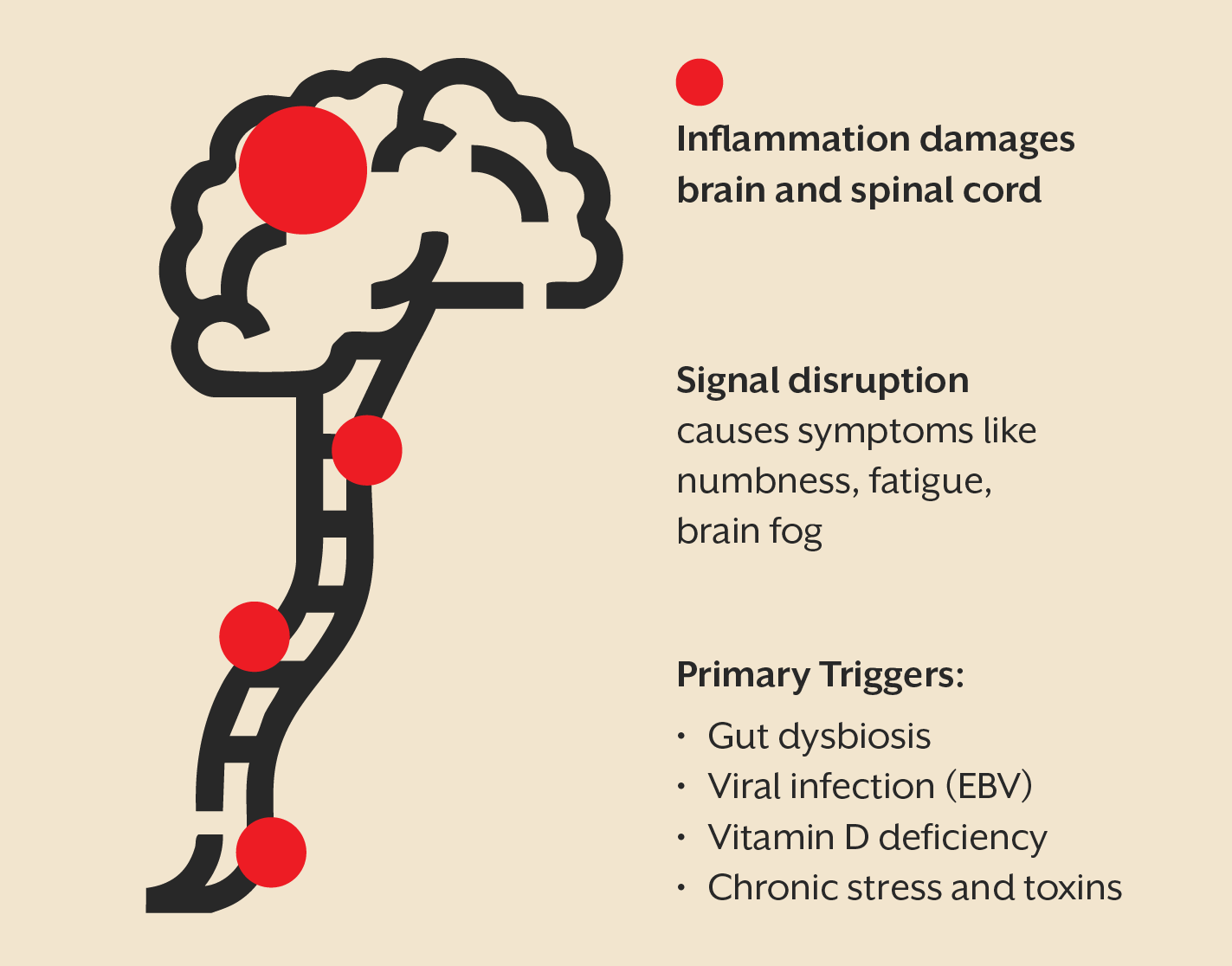 Multiple Sclerosis is mostly viewed as a mysterious neurological autoimmune disease — but it is not any random attack. It is the result of a complex interplay amongst genetic predisposition, immune misfires, gut imbalances and environmental exposure. The inflammation, neurological symptoms, and immune disruption, don't just occur in isolation — they reflect an inner terrain that's been quite overwhelmed.
