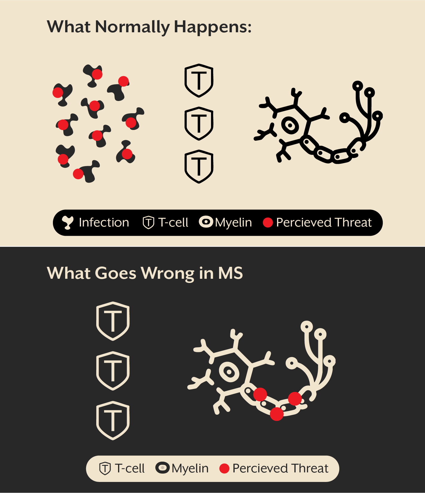 Under normal circumstances, T cells- the elite defenders of the immune system act as the guardian, recognising and eliminating all the harmful pathogens, viruses, and even the mutated cells. In Multiple Sclerosis, these guardians often lose their sense of self. Instead of defending the nervous system, they start targeting it, specifically the myelin sheath, the protective covering that insulates the nerve fibres in the brain and the spinal cord.