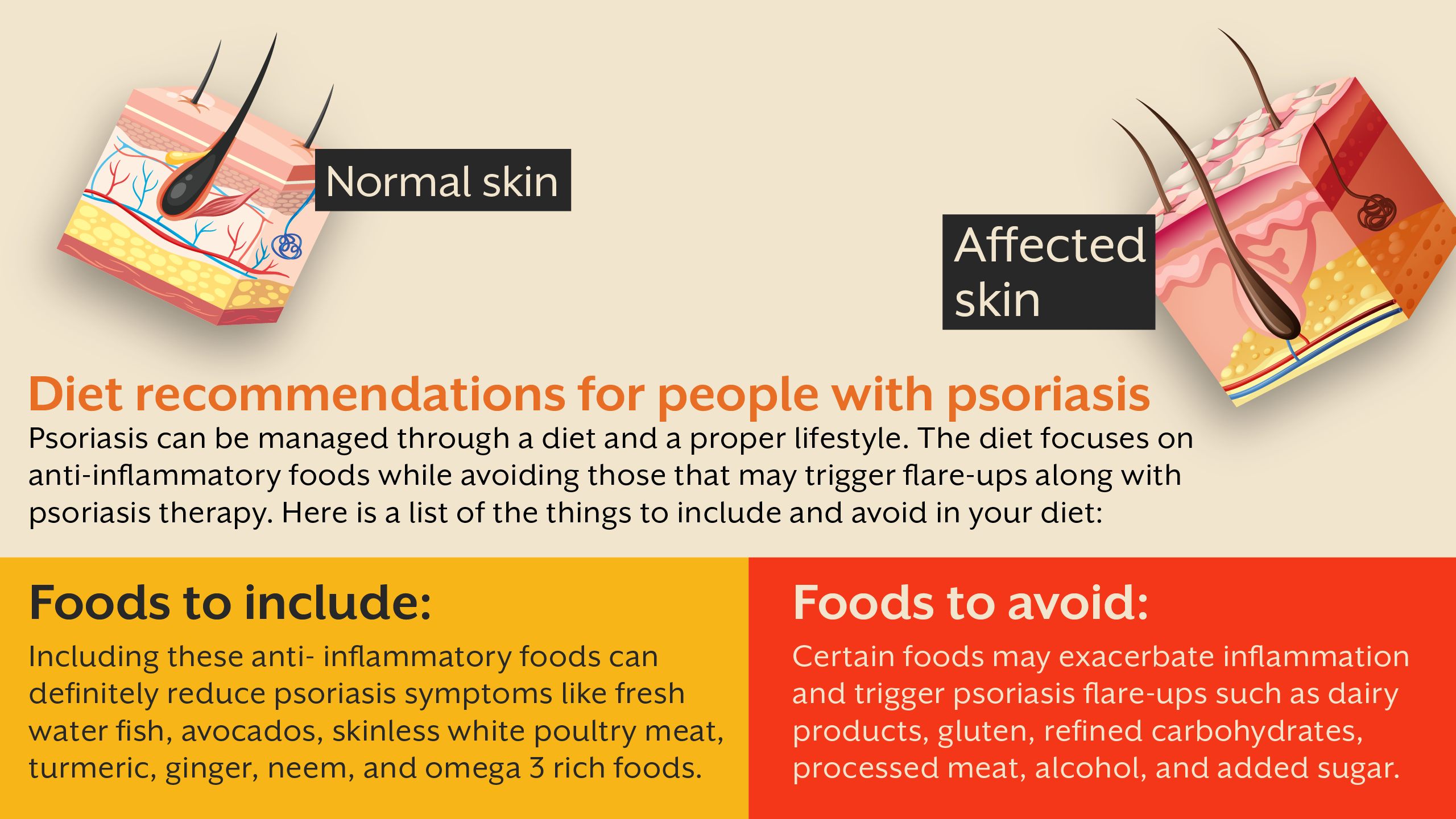 Psoriasis can be managed through a diet and a proper lifestyle. The diet focuses on anti-inflammatory foods while avoiding those that may trigger flare-ups along with psoriasis therapy. Here is a list of the things to include and avoid in your diet: