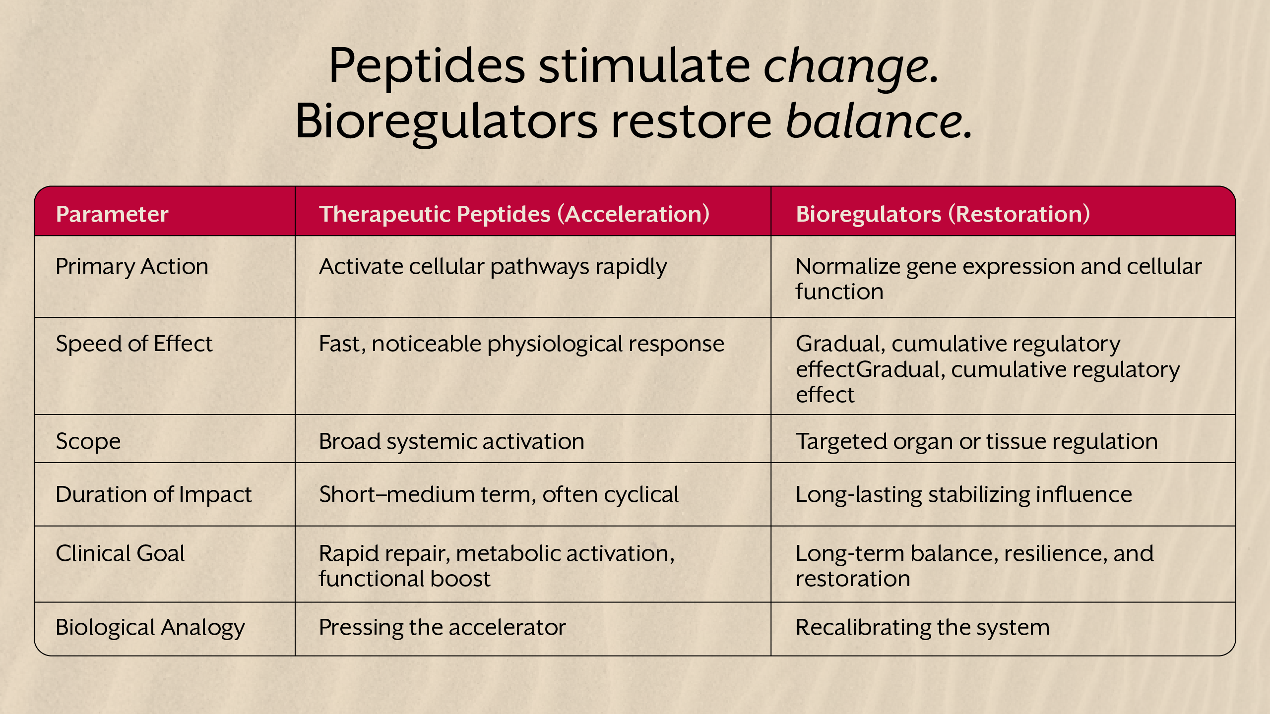 In clinical decision-making, peptides are often used when rapid metabolic intervention is required, while bioregulators support sustained cellular normalization.