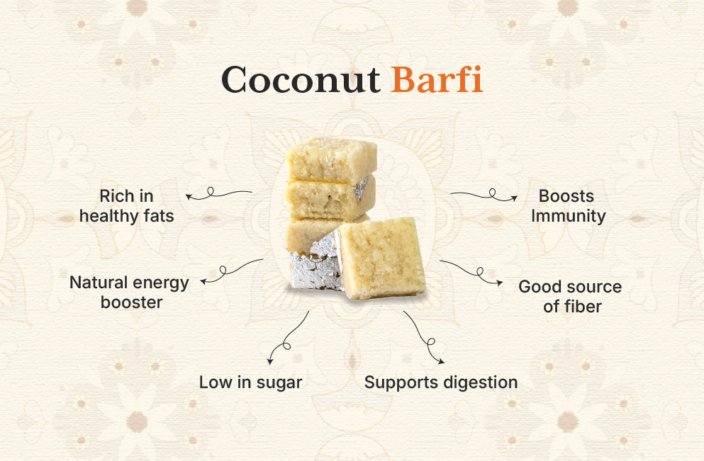 Coconut barfi isn’t just a delicious treat but it’s packed with nutrients! Made primarily from coconut, it’s rich in manganese, copper, and iron. These essential nutrients can boost your health in various ways, making this sweet smart choice a healthy Diwali snack. Here are the top benefits: