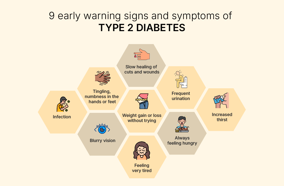 Type 2 diabetes is often called a "silent" disease because its symptoms can be hard to spot in the early stages. Many people may not even realize they have it until it’s progressed. Some of the common signs are: