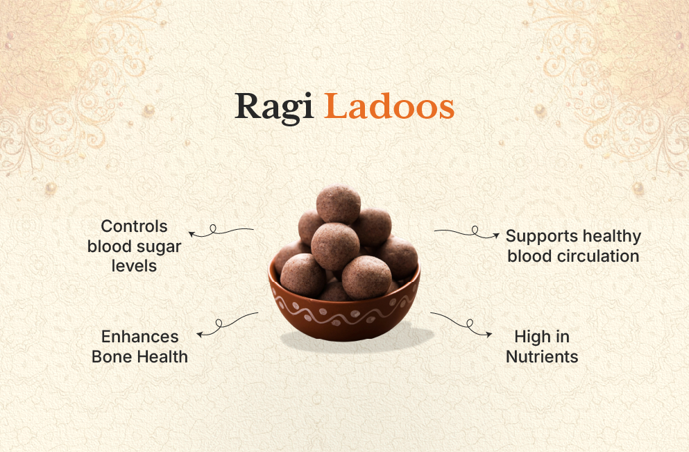 Ragi laddoo is a nutritious dessert option made for Diwali. We have used ragi flour, which is an excellent source of fiber, calcium, and protein, along with dates, which is a natural sweetener. This recipe is not only quick to prepare but also a healthy alternative to traditional sweets, which makes it suitable for diabetics as well as small children who seek nutrient-packed snacks.