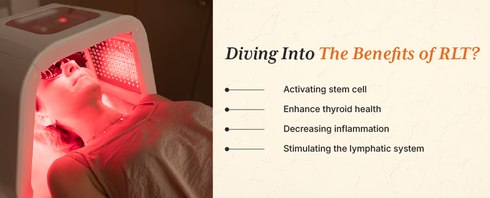 RLT works by exposing your body to red light. This light can penetrate deep into your skin, where mitochondria present in the skin cells absorb the red light. Your well-being usually depends on mitochondrial health; the mitochondria is responsible for producing an adequate amount of energy in the form of ATP for a cell. Red light stimulates cytochrome C oxidase, a protein that enhances energy production in human cells. This boosts mitochondrial efficiency in breaking down nitric oxide and generating more adenosine triphosphate (ATP), the cell's energy currency. Optimized ATP production supports cellular efficiency and facilitates the body's healing processes.