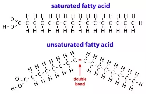 So how did Crisco make a solid fat out of liquid cottonseed oil? The process used is called hydrogenation. Unsaturated fats (monounsaturated fatty acids or MUFAs and polyunsaturated fatty acids or PUFAs) are liquid because one or more links in their carbon chains have missing hydrogen atoms and thus form double bonds- this results in an unsaturated chemical structure (see picture below), creating a liquid physical state.