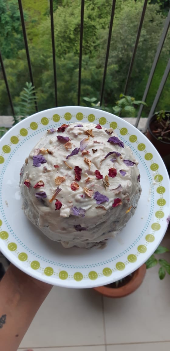 Top with rose petals and other dried edible flowers. Keep in refrigerator until its time to celebrate.